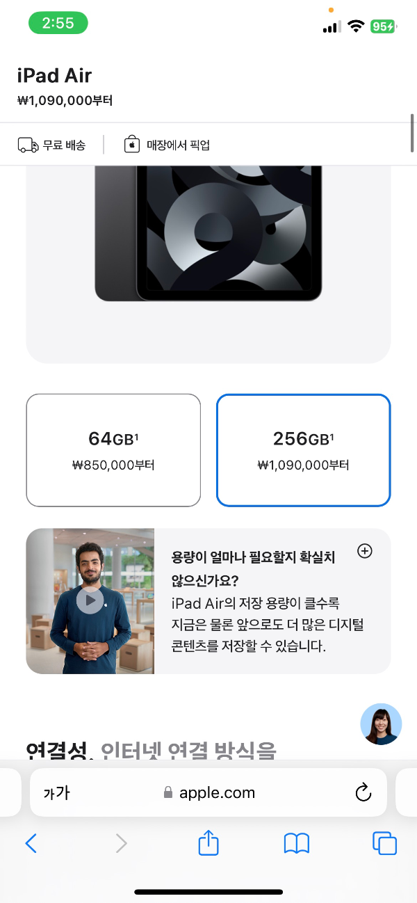 아이패드 에어같은 경우에는 64기가 85만원 / 256기가 109만원 입니다.
