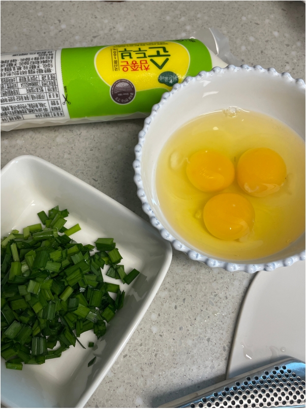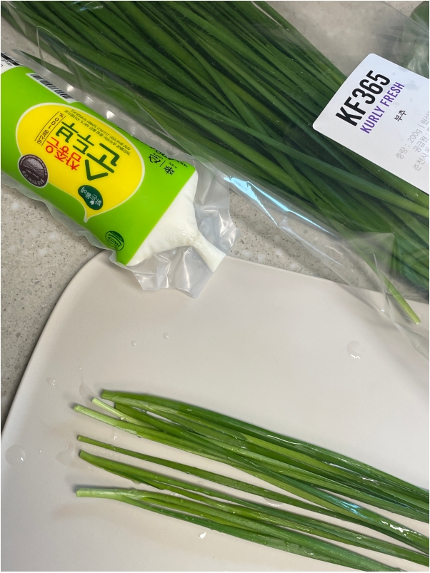 순두부와 부추, 계란입니다. 부추는 대파로 대체가능하지만 부추로 먹을때 엄청 시원하고 맛있어요.