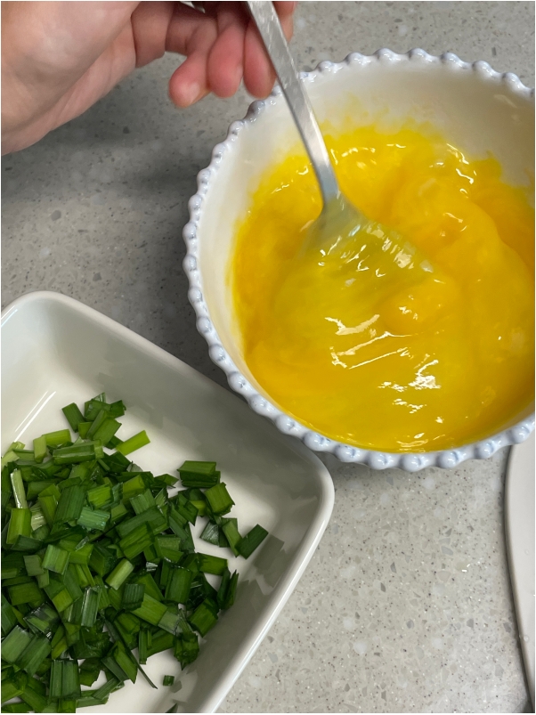 3. 마지막으로 썰어둔 부추와 풀어둔 계란을 원을 그리듯 부어주고 살살 저어주면서 불을 뜹니다.