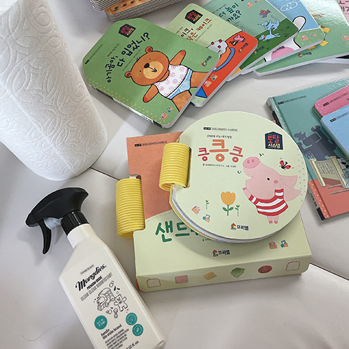 아기 소독제로 깨끗이 닦아주고 책꽂이 한편에 꽂아두니 보고 싶을 때 쏙쏙 꺼내서 읽어달라고 가져오네요.