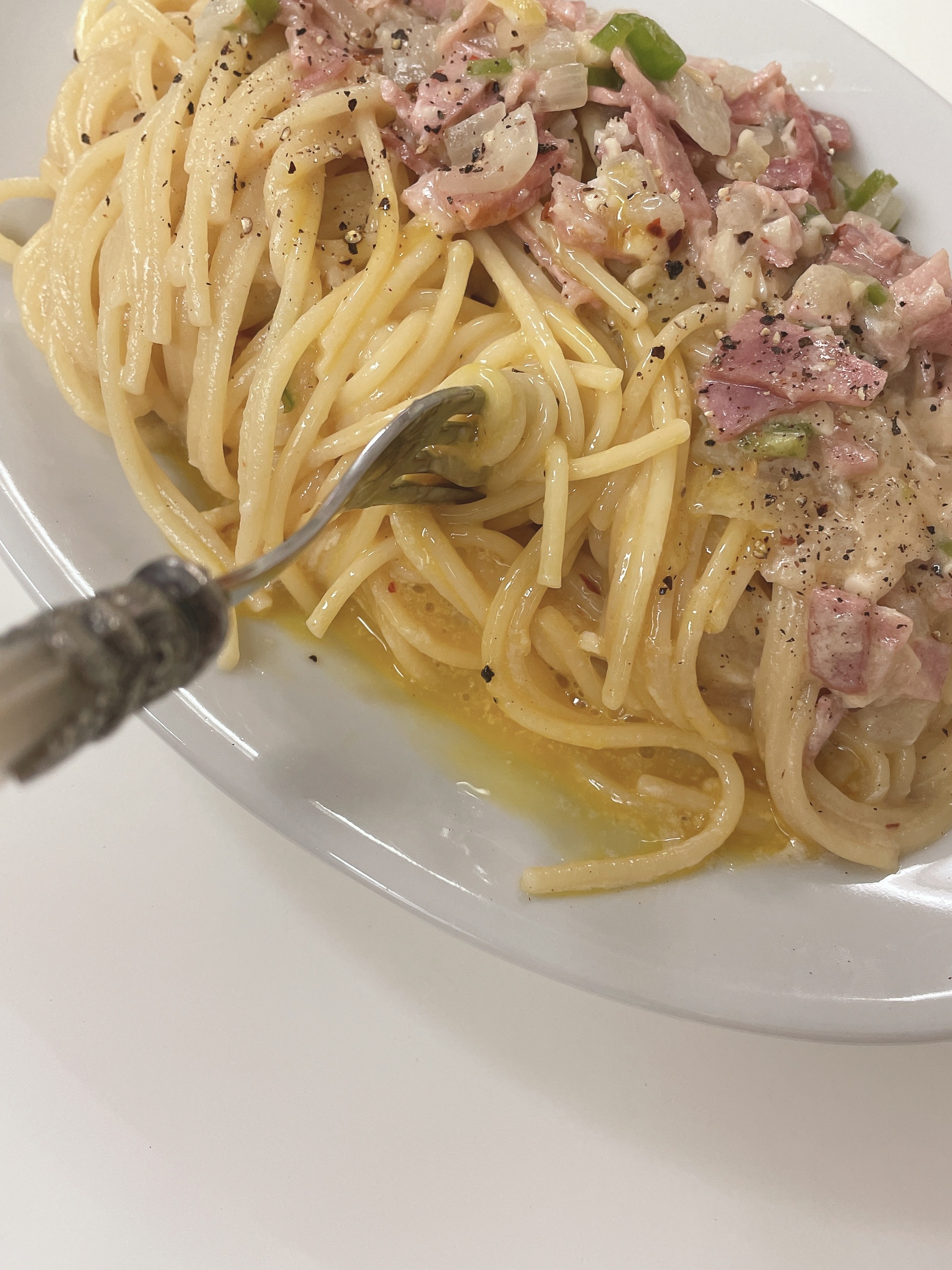 고기가 살짝 부족해서 급하게 까르보나라도 만들었어요.