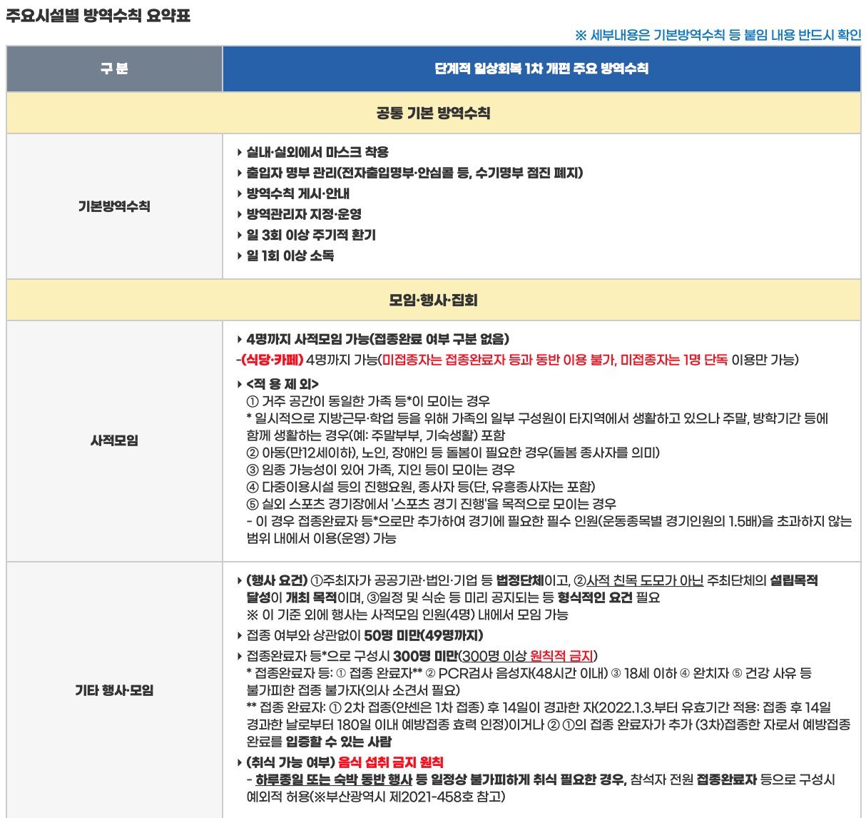 기타 행사나 모임은 접종 여부와 상관없이 100명->50명으로 축소되었습니다.