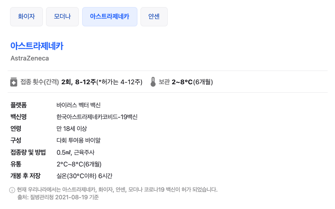 -아스트라제네카는 18세 이상에게만 접종이 가능하여 현재 어르신들께 접종이 가장 많이 권유가 되었고 8주에서 12주 간격으로 2회 접종을 합니다.