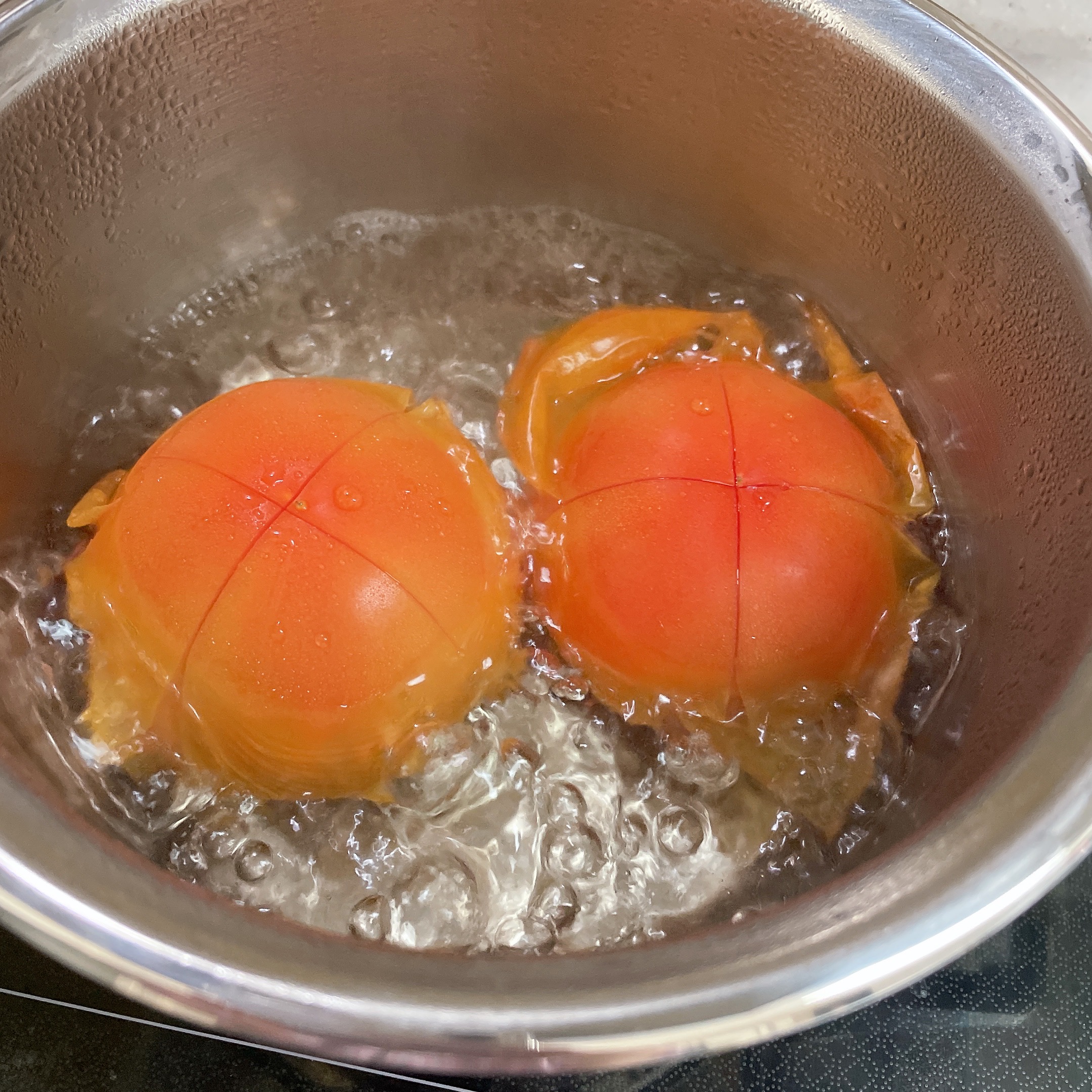 1. 먼저 토마토를 끓는 물에 살짝 데쳐서 껍질을 벗깁니다.