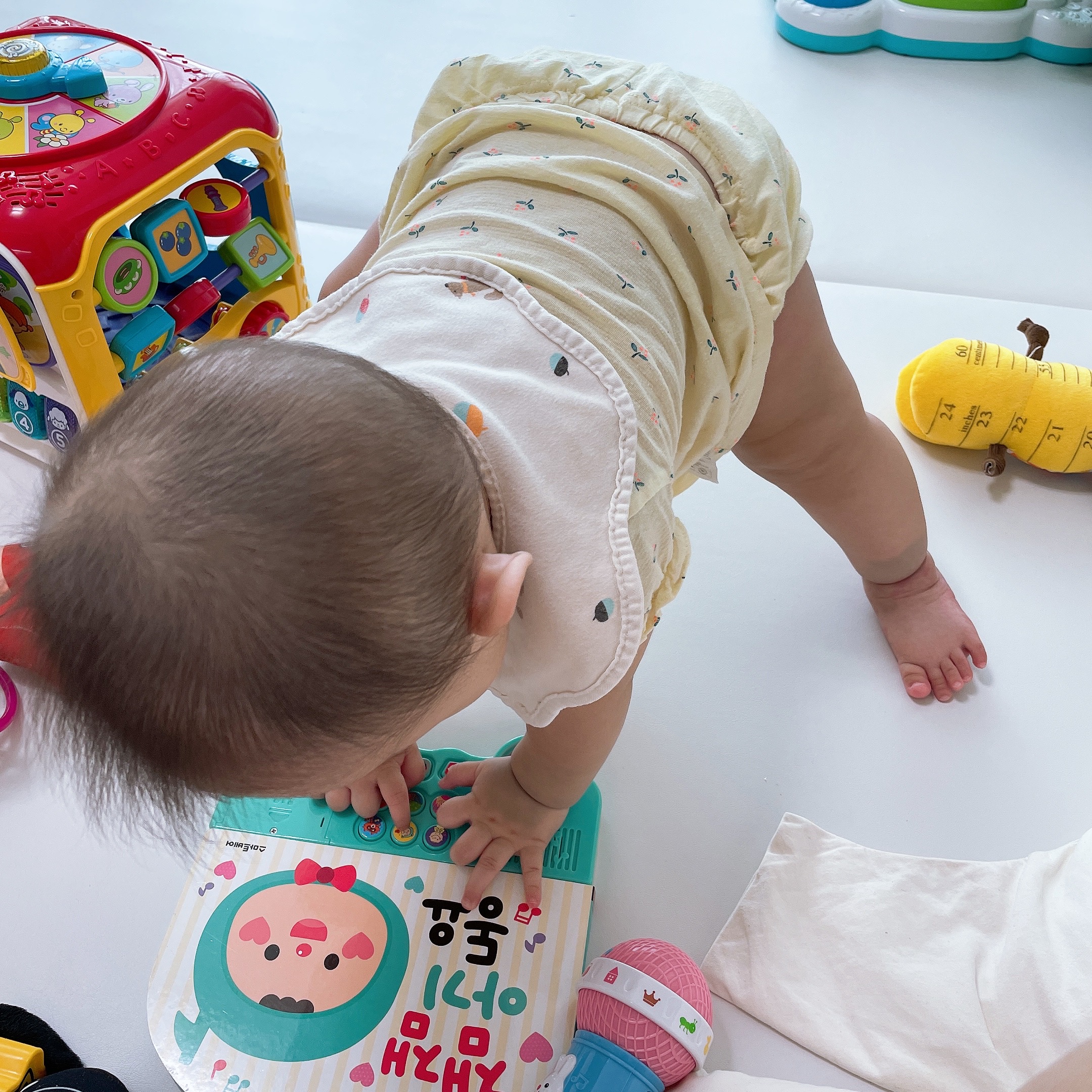 아기가 깨어 있는 시간에는 가능한 아기에게 집중하여 같이 놀아준다. 함께 놀아주는 시간이 많을수록 자극에 반응하는 속도도 빨라지고 그만큼 발달도 빠른 아기가 되어 똑똑한 아기가 되어간다. 하루하루 성큼성큼 눈에 띄게 자라는 시기이니 만큼 아기의 새로운 반응행동을 놓치고 호기심도 보여주지 않으면 소극적이고 발달이 느려가는 아기로 자라게 된다. '어차피 크면 다 똑같아'라고 흔히들 말하고 그 말에 나도 너무나 동감하지만, 아기마다 흡수하는 양은 천차만별이라고 생각이 들고, 점점 커갈수록 그 양은 비교도 안될 만큼 차이가 많을 것이라고 생각한다. 아기가 커서 스스로 잘하고 하고 싶은 일을 하면서 행복한 삶을 살게 하고 싶다면 아기가 어릴 때 일 수록 최선을 다해 아기와 시간을 보내주고 집중하여 함께 반응해주고 호기심을 자극해주는 것이 가장 좋은 교육이지 싶다. 아기한테 말을 가르칠 때에는 '정해진 말'을 두고 반복적으로 대화에 꼭 넣어주는 것이 좋다. 매일 아침 "잘 잤니?" 분유(모유)를 먹기 전에 "맘마 먹자" 이런 식으로 늘 규칙적인 행동에 항상 같은 말을 반복적으로 넣어주면 아기의 말문을 빨리 트이게 말을 걸어주는 것이다. 이런 식으로 대화 중 가장 많이 쓰는 단어가 아기의 이름이 될 텐데, 그렇기 때문에 이 시기쯤에는 이름을 부르면 반응하고 쳐다볼 것이다. 예를 들어 밥을 먹을 때 "계란이야"하고 말을 하고 다음날엔 "달걀프라이야"혹은 "스크램블이야" 이런 식으로 하지 말고 꾸준히 "계란이야"라고 하는 것이 좋은 것이다. 계란 요리의 종류는 아기가 알아서 눈으로 보고 맛을 보고 머릿속에 넣고 분류해 간다. 아기에게 같은 자극을 반복해서 보여주고 들려줌으로써 신경회로가 활발하게 활동하게 된다. 이 시기의 아기들은 아직 신체를 이동하여 기는 것이 어려운데, 팔과 다리를 활발하게 움직이기 시작하면 엎드린 자세에서 누운 자세로 자유로이 위치를 바꾸는 법을 터득하게 된다. 이때의 목표는 빨리 기어 다니기를 다르 쳐서 이동할 수 있게 하는 것이다. 뒤집기보다 더 기쁘고 기다려지는 순간이 기어 다니는 순간이다. 가장 큰 이유는 아기 스스로가 원하는 장난감을 직접 골라 가지고 놀게 하고 싶어서 누구보다 기다렸던 것 같다. 아기가 앉은 후나 엎드렸을 때 다시 눕혀줄 때에는, 반드시 옆으로. 쓰러져서 눕히는 운동을 가르쳐야 한다. 허리 쪽을 살짝 뒤로 밀어줘서 스스로 바로 누운 것처럼 느끼도록 유도해준다. 앉아있다가 한쪽 팔을 짚고 고꾸라지는 게 반복적이게 한다. 이때 허리에 힘이 생기기 시작하면 나중에는 반동으로 팔을 집고 일어나거나 넘어지려고 할 때 버티거나의 행동을 한다. 허리의 근력이 생기기 시작하면서부터. 방석이나 이불을 가져다가 놓아두어 바닥에 머리를 강하게 부딪히는 일이 없도록 해준다. 이쯤 되면 앉아서 노는 것이 크게 무리가 없으니 앉을 수 있다면 앉아서 놀기를 시킨다. 다리를 조금 벌리게 하고 두발 사이에 장난감을 두면 보다 오래 놀 수 있다. 처음에는 짧은 시간으로 시작해서 점점 길게 앉히고 끝나고 누울 때는 반드시 그 옆으로 쓰러지듯이 등을 펴주며 아기가 스스로 다리를 뻗을 수 있게 한다. 이게 반복이 되면 나중에는 다리를 쭉 펴고 버텨보려고 혼자 안간힘을 쓰기도 한다. 점점 근력이 생기는 것이다. 네발기기를 할 때 무릎을 대고 손을 쭉 피고 길게 되기 때문에 손에 힘이 강하게 작용한다. 엉덩이와 허리 쪽을 붙잡아 주면서 손바닥을 활짝 펼 수 있도록 기기를 유도해 준다. 손을 펴면 힘이 분산되어서 안정감이 생기기 때문에 균형을 잡기가 더 쉽고 혹시나 앞쪽으로 균형이 쏠릴 수 있으니 허리나 엉덩이를 붙잡으면서 균형 잡는 걸 도와주는 게 도움이 될 수 있다. 체중을 몸 한쪽에 실리게 해서 반대편 손이 앞으로 나오기 쉽도록 한다. 아기의 허리를 들어 올리고 있는 손이 좀 가벼워졌다 싶으면 받쳐주고 있던 손에서 힘을 뺀다. 이런 식으로 다리 힘을 길러가고 발끝이나 발꿈치에서 무릎과 함께 힘을 주는 근육을 어떻게 사용해야 할지 아기가 터득한다면 금방 잡고 서기 시작한다.