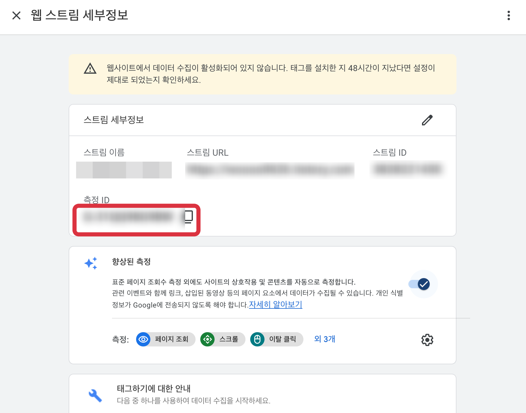 아까 전에 구글 애널리틱스 세부 스트림에서 복사한 측정 ID 있죠?
