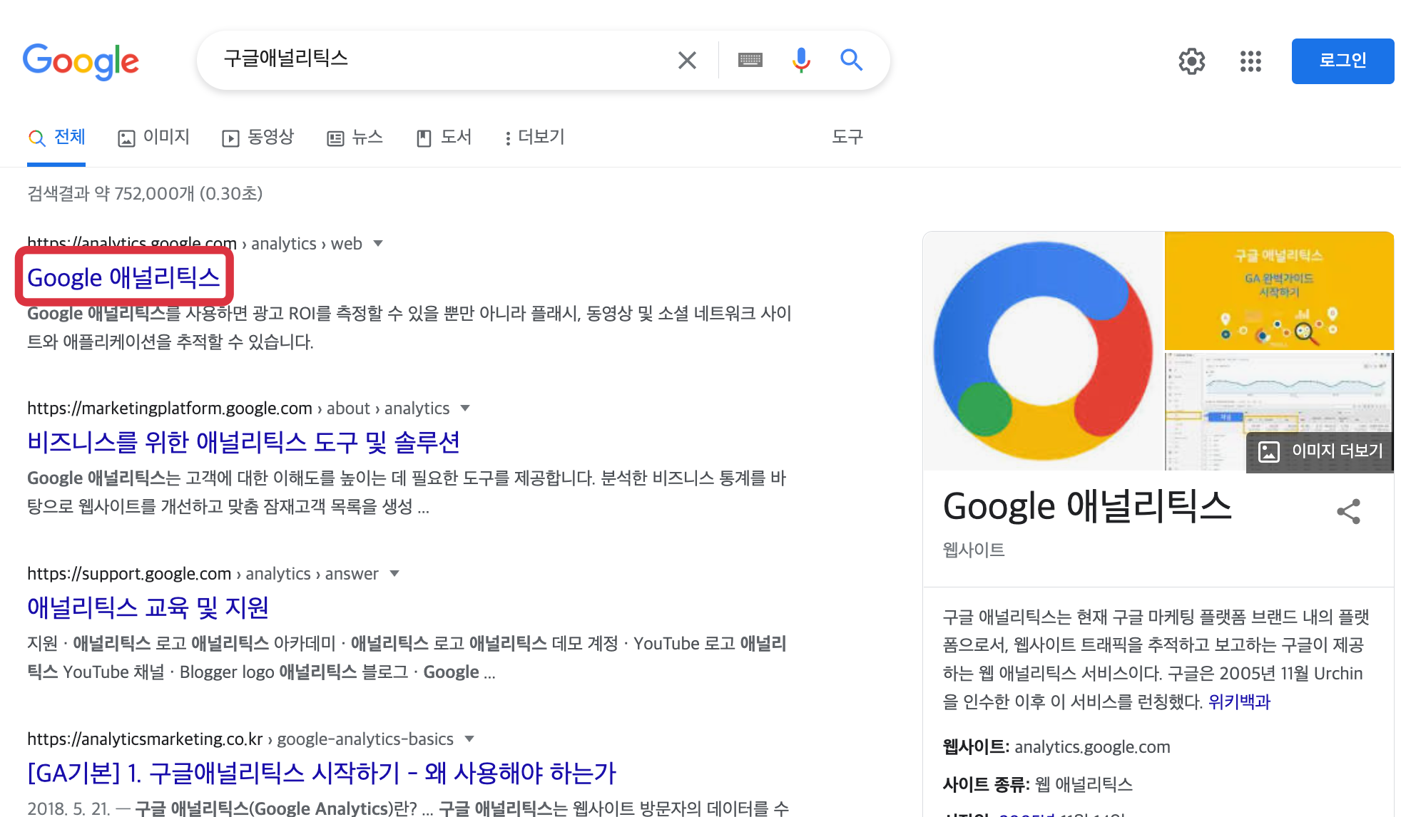 첫 번째로 "구글 애널리틱스"를 검색합니다.