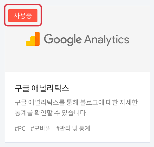 완료되었을 때 구글 애널리틱스가 사용 중으로 바뀐 것을 볼 수 있습니다.