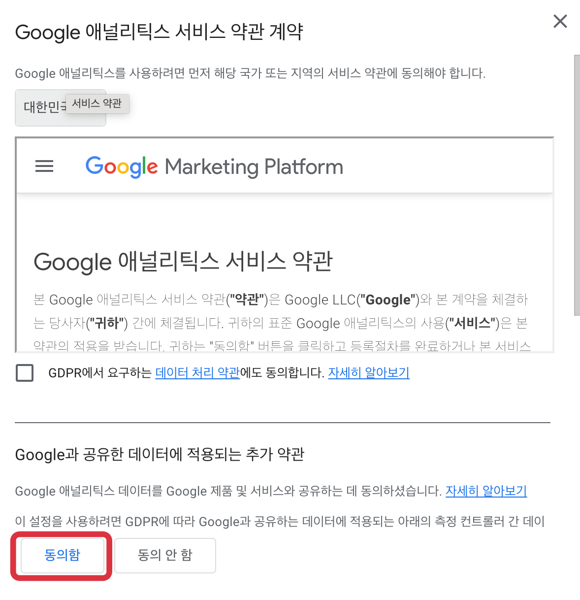 거의 마지막 단계입니다. 구글 애널리틱스 서비스 약관에 동의를 해주시면 됩니다.